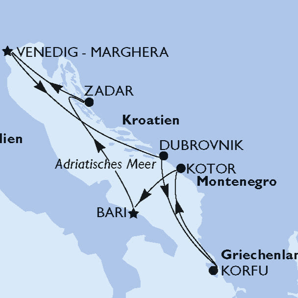 🌍 Route: Venedig – Bari – Korfu – Kotor – Dubrovnik – Zadar – Venedig
